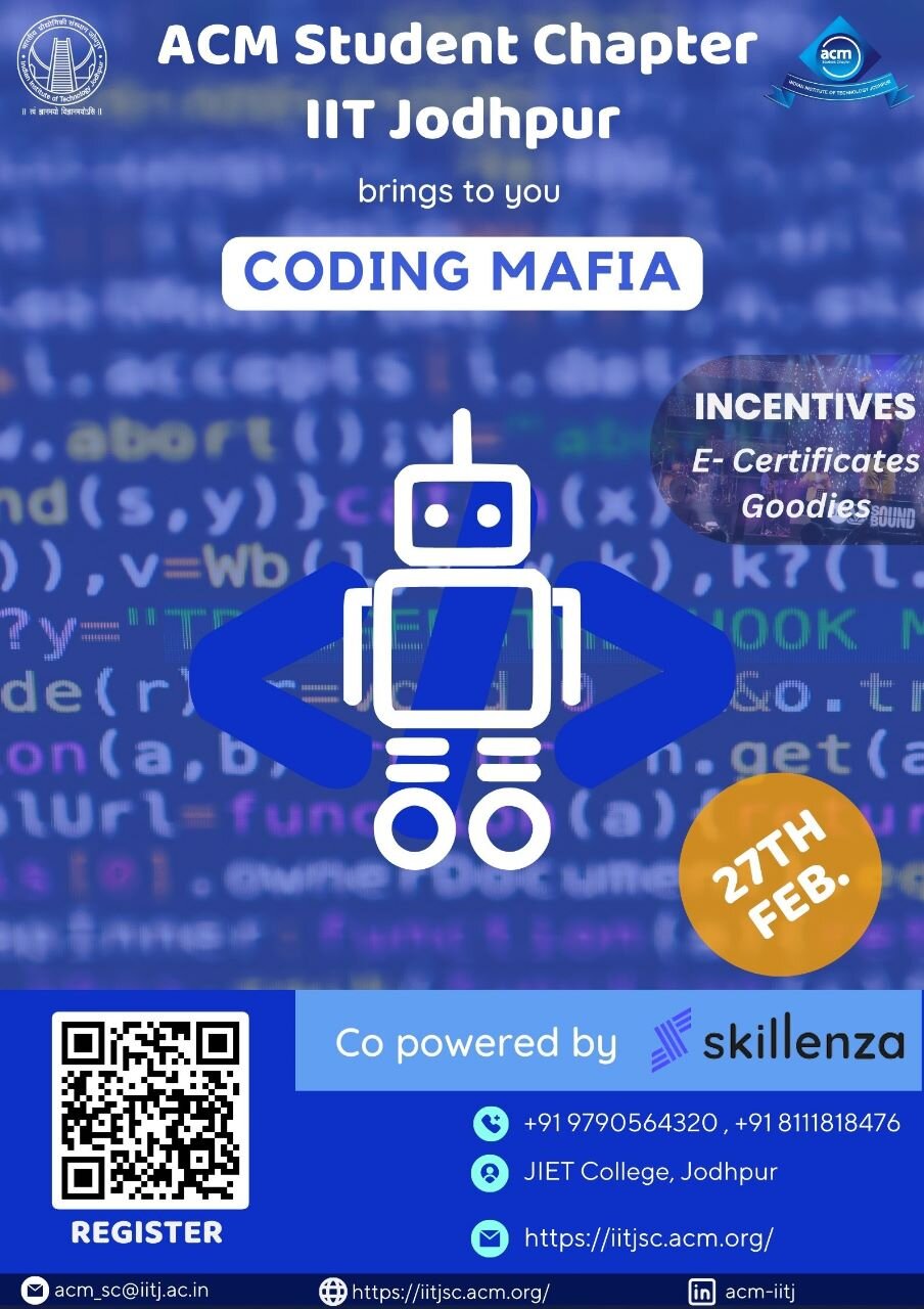 Coding Mafiais an exhilarating two-round event organized by ACM Student Chapter IIT Jodhpur in association with Skillenza for the students of Jodhpur Institute of Engineering & Technology (JIET). It is designed to push participants to the limits of their coding abilities and showcase their creative problem-solvingĀ skills.